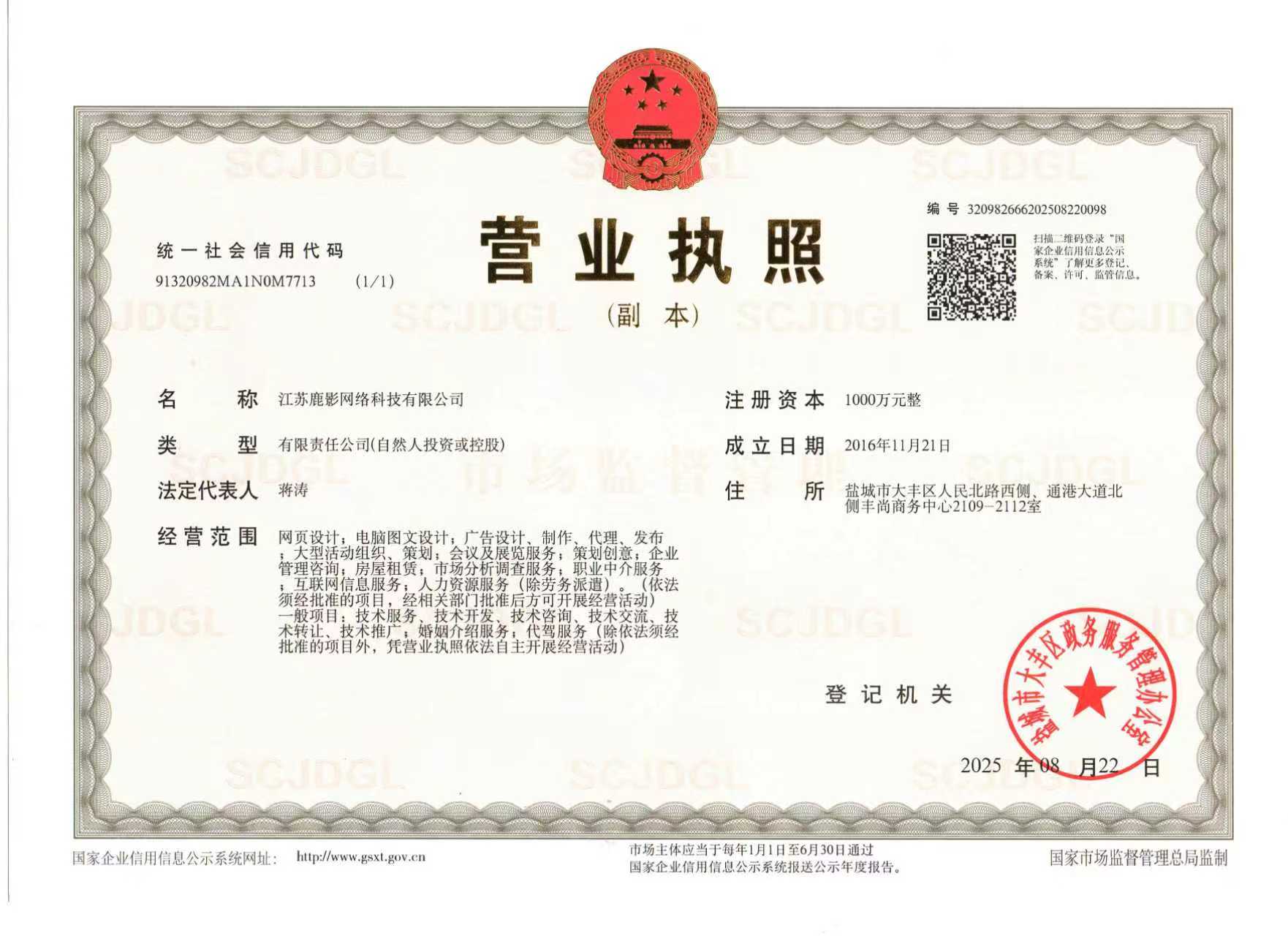 Copyright @江苏鹿影网络科技有限公司通讯地址:盐城市大丰区人民北路西侧、通港大道北侧丰尚商务中心2109-2112室